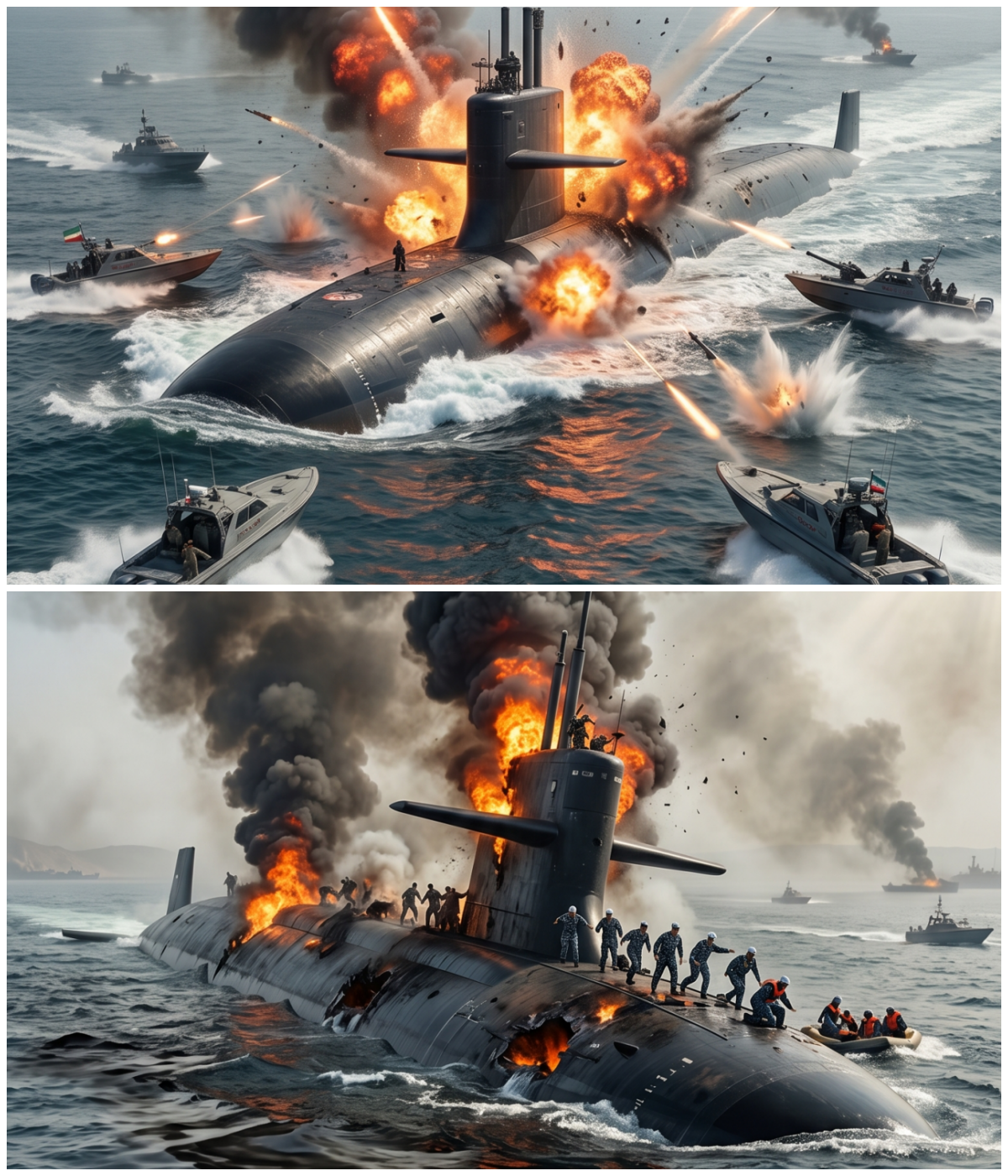 Within minutes of positioning itself, the submarine launched heavyweight torpedoes and Tomahawk cruise missiles at Iranian naval ᴀssets and coastal installations. Multiple IRGC fast-attack boats and two Kilo-class submarines were hit and sunk almost instantly. Explosions ripped through the dark waters as burning vessels sank rapidly, sending thick plumes of smoke into the early morning sky. Iranian attempts to locate and counter the American submarine failed completely — the vessel remained invisible to their aging sonar systems.