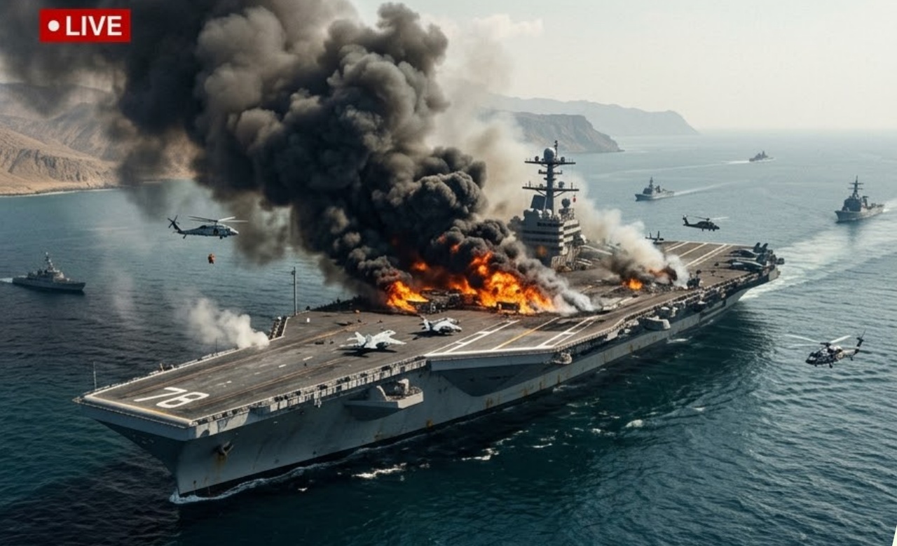 According to initial reports, the fire broke out after the carrier was struck by multiple Iranian drones and at least one anti-ship missile that penetrated the layered defense screen during a heavy IRGC swarm attack. Thick black smoke billowed from the flight deck and hangar bays as intense flames raged for several hours. Damage control teams fought heroically to contain the blaze, but the carrier has sustained significant damage to propulsion systems and flight deck equipment, rendering it temporarily disabled and requiring urgent repairs.