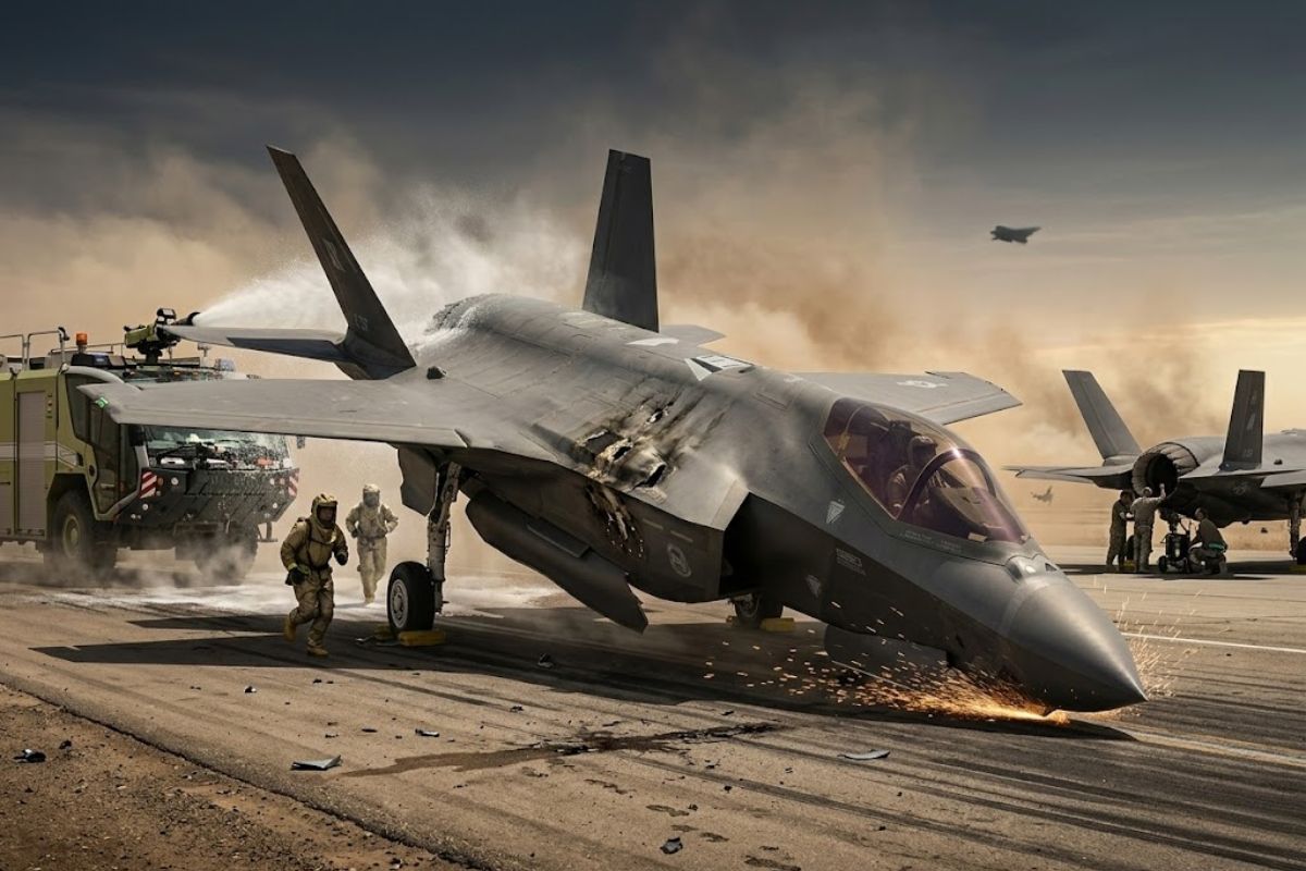 00:02 – The F-35 made an emergency landing at a US air base in the Middle East (or a nearby aircraft carrier). The tires caught fire, and thick smoke billowed. The pilot ejected safely, suffering only minor shoulder injuries. However, the aircraft – worth over $100 million – was severely damaged, marking the first time an F-35 has been directly hit in actual combat.
