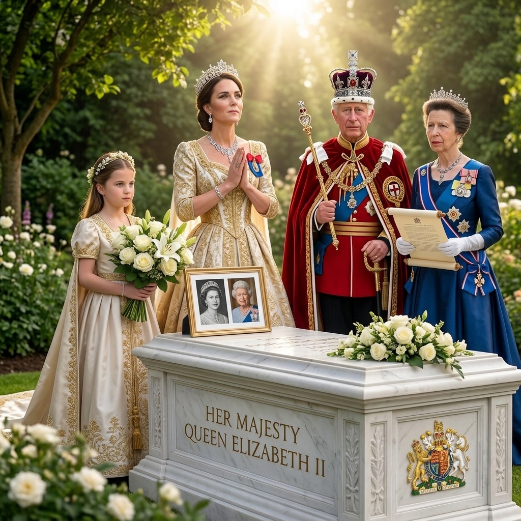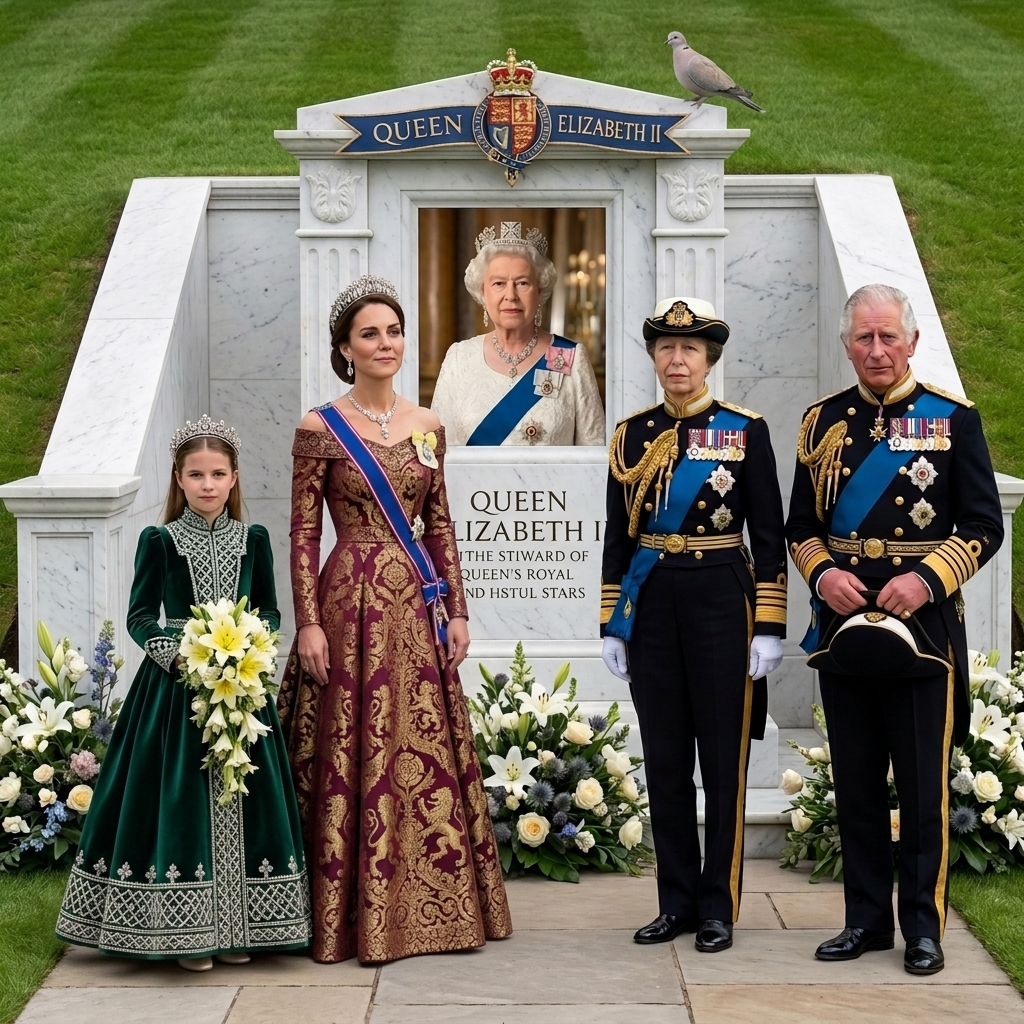 In a deeply moving and private moment that captured the imagination of royal observers, Princess Catherine, Princess Charlotte, and Princess Anne were said to have made a discreet visit to the resting place of Queen Elizabeth II. The unannounced nature of their visit quickly sparked interest and speculation, particularly at a time when the monarchy continues to navigate a rapidly changing world. Elegantly dressed in dark, formal attire, the three figures were seen in thoughtful discussion. Princess Charlotte carried a small arrangement of white flowers, while Princess Anne held a folded note. Princess Catherine stood slightly apart at one point, her hands gently clasped, her gaze lifted as if reflecting or seeking quiet reᴀssurance. Adding to the poignancy, a lone white bird was noticed resting nearby, prompting many to interpret it as a symbolic presence.