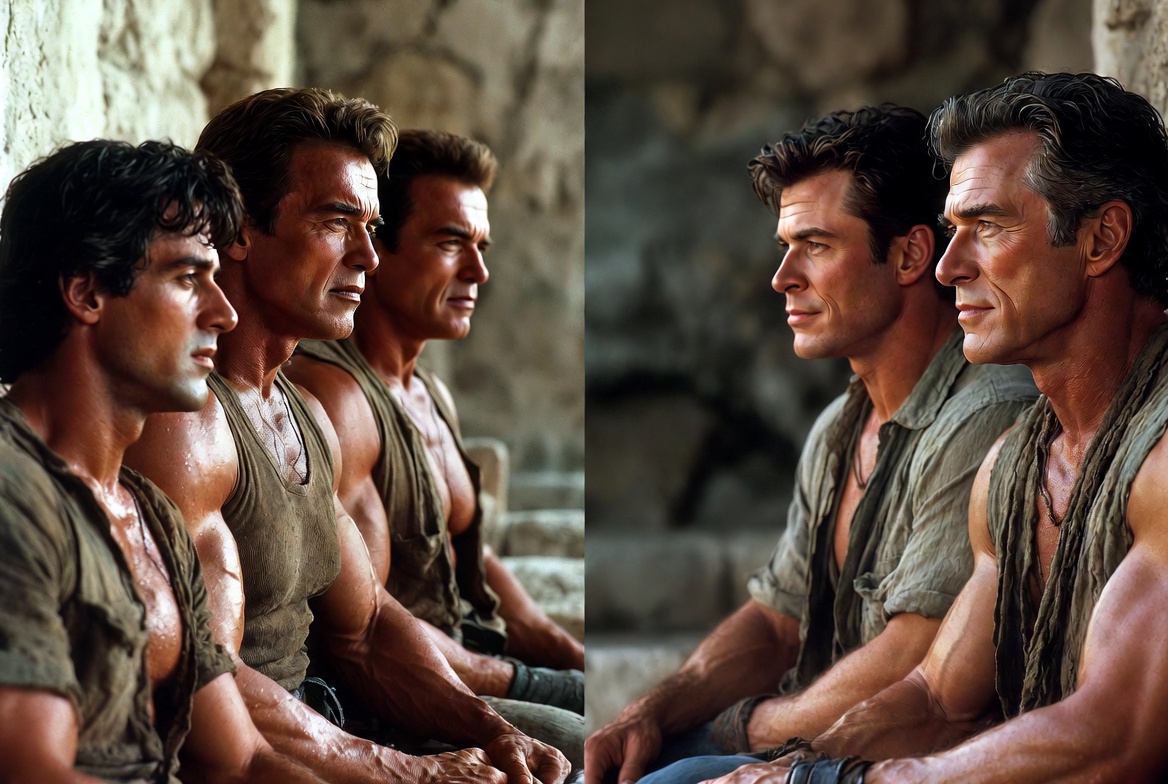 Sylvester Stallone as the young, battle-hardened Rambo sits shoulder to shoulder with his older, wiser self. Beside him, Arnold Schwarzenegger — once the unstoppable force of the 80s — sits quietly next to the man he has become. Jackie Chan, the martial arts icon who laughed through pain and danger, appears both in his fearless youth and his seasoned grace. And completing the circle is Chris Hemsworth, the new generation’s torchbearer, sitting among the giants who paved the way for him.