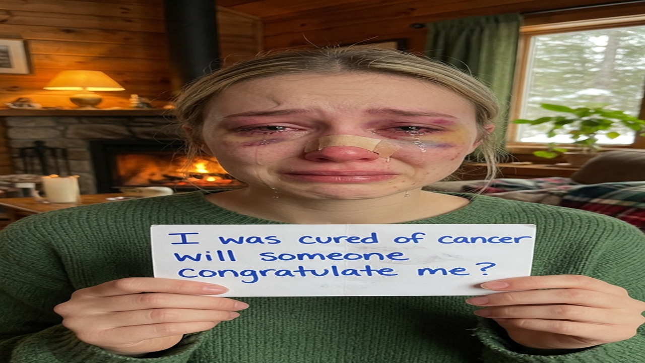 A deeply moving pH๏τo circulating on social media shows a young woman with a tear-streaked face, swollen and bruised eyes, and a bandaged nose, holding a handwritten sign that reads: “I am cured of cancer. Will anyone congratulate me?”